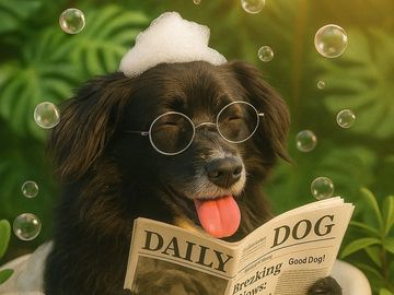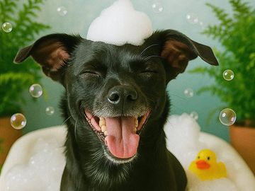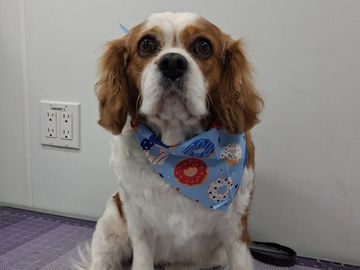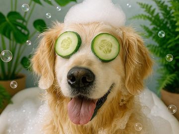 Includes a bath with custom shampoo and conditioner, a gentle plum facial, ears cleaned and anal glands expressed as needed, blow dry, brush out and de-shed as needed, nails clipped, paw pads and sanitary shave as needed, spritz of plum scented doggy cologne and a bandana!